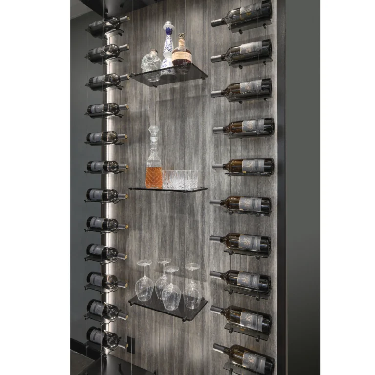 This racking is customizable to fit your design needs. Each column consists of four high-tension cables and glass bottle holders. Space bottles farther apart for a beautiful minimalist wine storage solution.