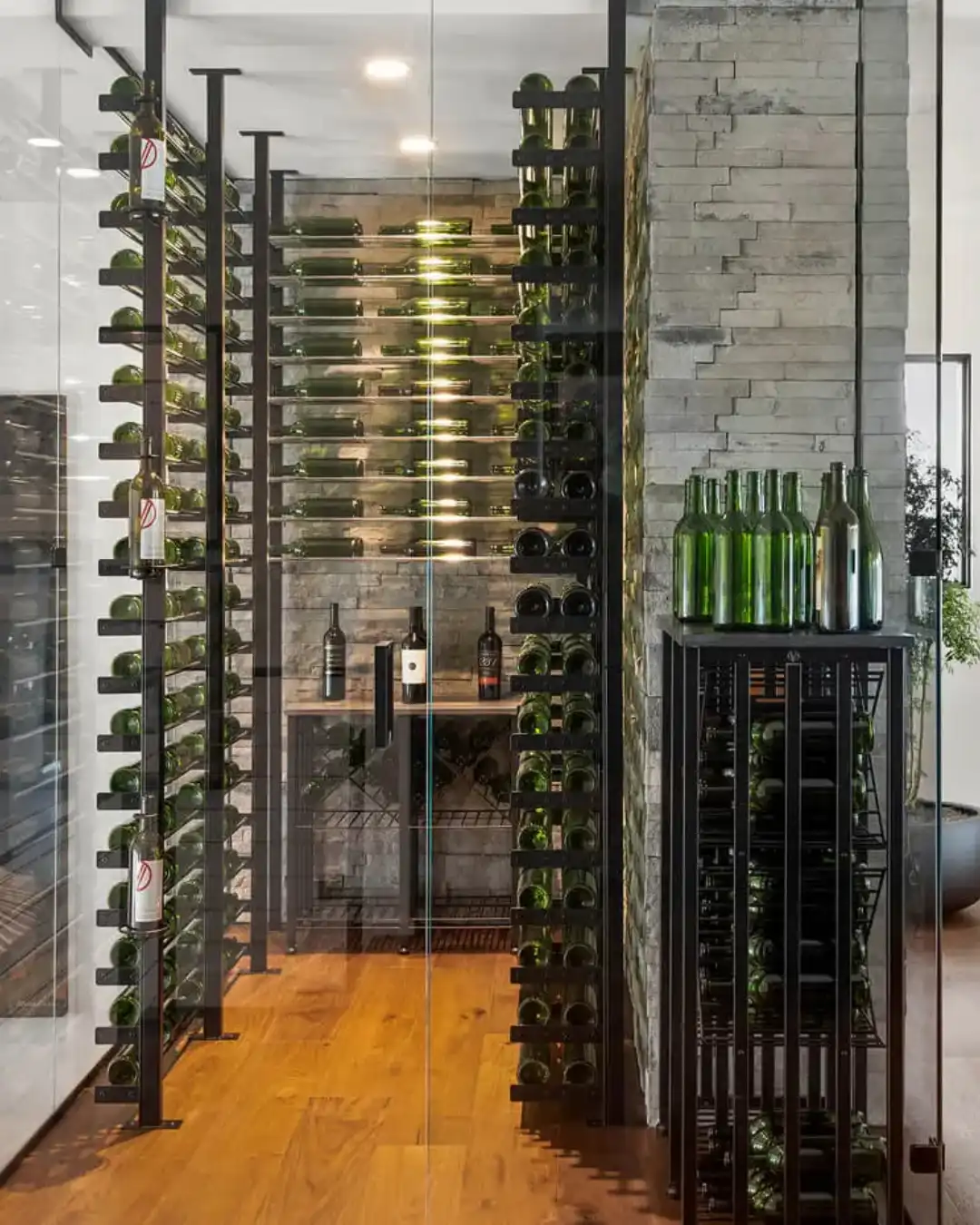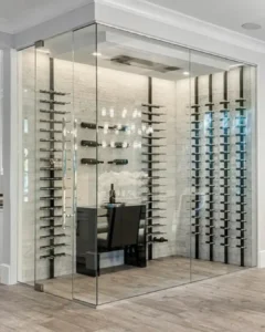 Clients are free to customize their wine cellar racking with features such as angled bottle displays, accent lighting, and floating shelves.