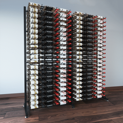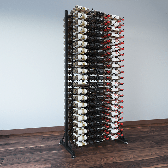This freestanding display holds an amazing 378 bottles in a compact space. Standing 7-feet in height, the largest Island Display Rack highlights more than 31 cases of wine in the patented steel wine cradles.