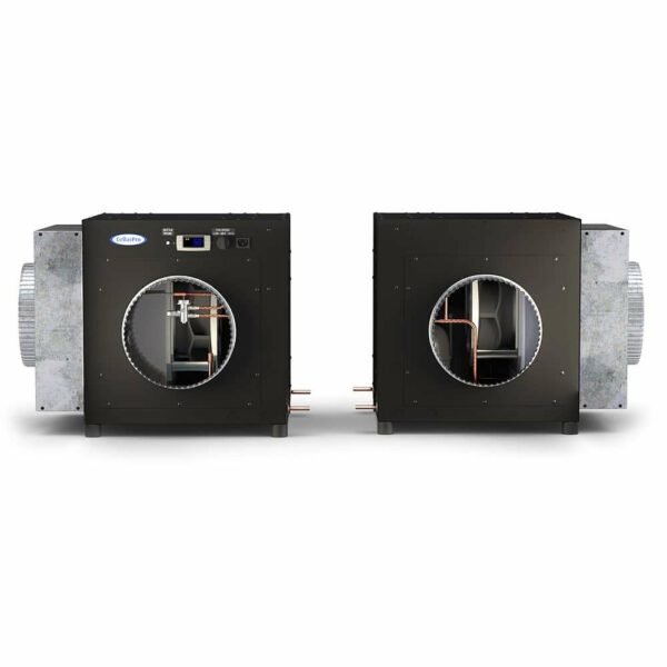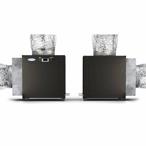 - Collars or grills for INTAKE (ie Return) are located at each end (left: evaporator, and right: condenser), and include professional-grade air filters to protect the unit.