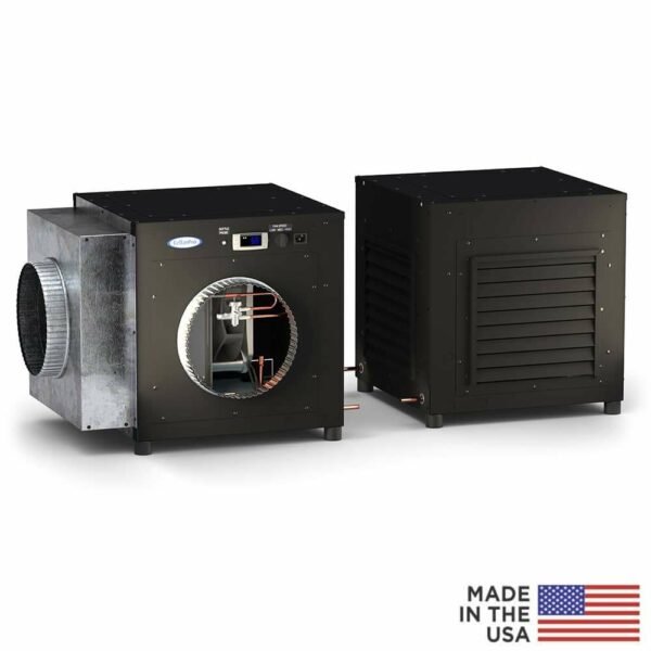 Capacity: 7156 BTUH @ 55F Size: 18.6 W x 18.6 D x 19.3 H (in) (Evap) Weight: 180 lbs Power/Rating: 115V AC / 60 Hz Condensing Unit Dimensions: – 120 lbs (no humidifier) – 18.6 W x 18.6 D x 19.3 H Evaporator Unit Dimensions: – 60 lbs – 18.6 W x 18.6 D x 19.3 H Power: – Startup Amps: 53.0 Amps – Running Amps Cord-Connected: 17.0 Amps – Total Watts: 1408 (low fan speed) BTUH @ 55F – Low Fan Speed: 6245 – Med Fan Speed: 6649 – High Fan Speed: 7156 Evaporator Decibels – Low Fan Speed, Ducted: 47 dbA – Med Fan Speed, Ducted: 51 dbA – High Fan Speed, Ducted: 59 dbA Condensing Unit Decibels – Low Fan Speed, Ducted / Non-Ducted: 54 dbA / 67 dbA – Med Fan Speed, Ducted / Non-Ducted: 59 dbA / 72 dbA – High Fan Speed, Ducted / Non-Ducted: 64 dbA / 77 dbA Warranty: 2 Years (Entire System) / 5 Years (Compressor) |