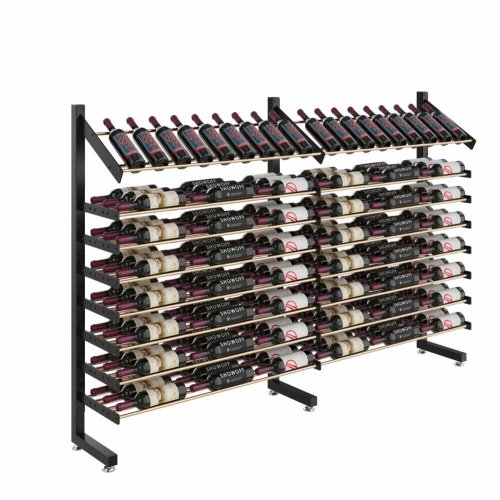 With a Presentation Row on top that showcases wine bottles as if presented by a server, key vintages steal the show from across the room. Ample label-forward storage below continues the artistic feel from top to bottom. This single-sided extension, when attached to a base, can scale to any size against walls in residential or retail environments.