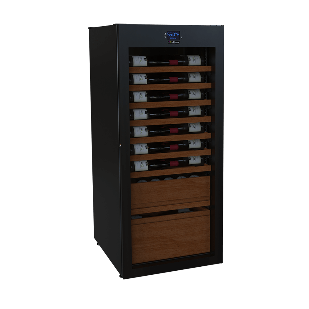 This preconfigured cabinet contains shelving and drawers selected for connoisseurs who need bulk storage but also want to show off some of the finer wines in their collection with label-forward shelves.