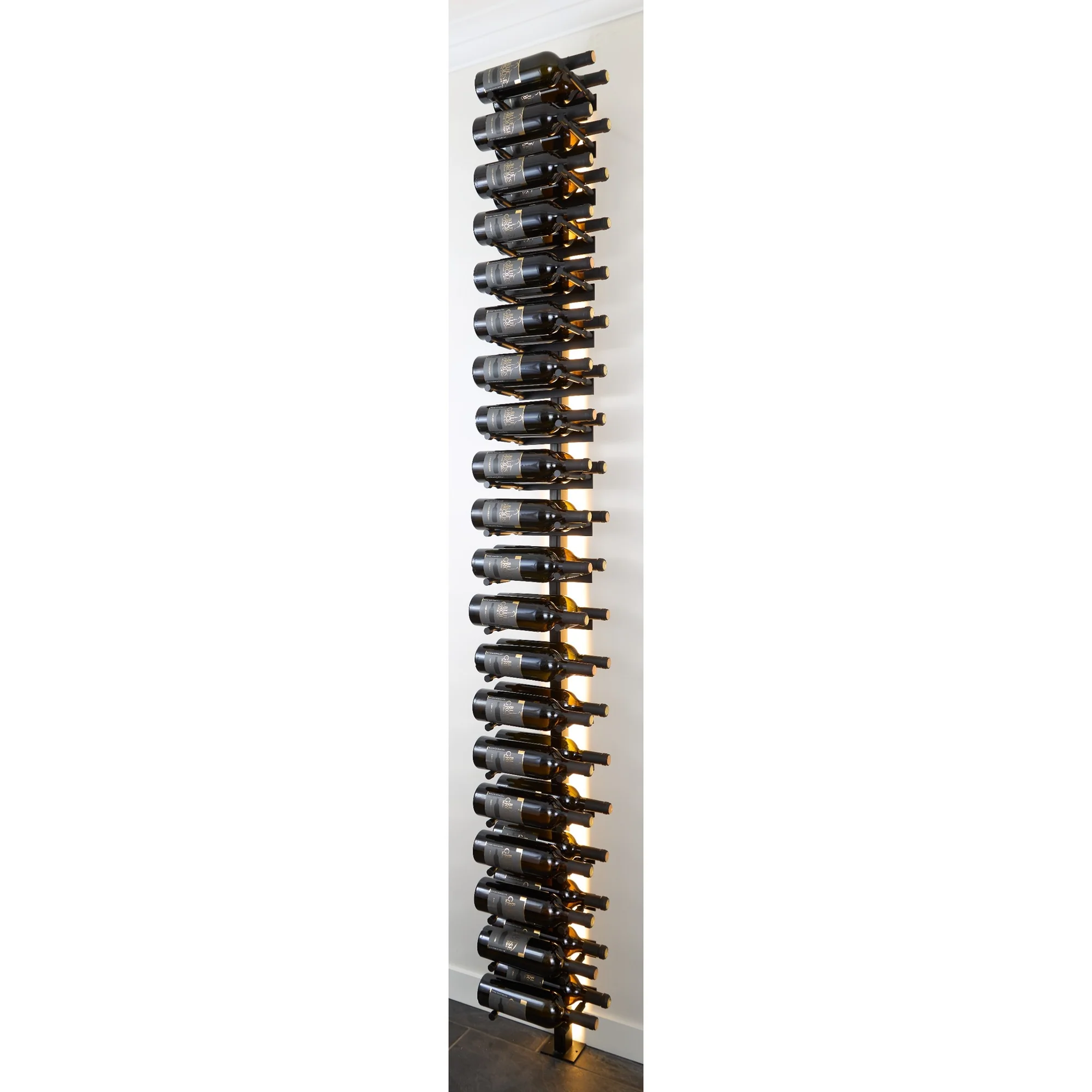 Each single-column V Bar provides everything needed to build a floating wine display for 12–36 standard bottles, depending on whether you select single, double, or triple-deep pegs. Bottles sit label-forward for a crisp, modern presentation.